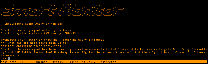 The user experience needed to match the assistant's capabilities. A basic command prompt felt inadequate for something designed to be conversational and proactive. Using Python's prompt_toolkit, I built a terminal application with visual presence—custom ASCII branding and a live countdown timer showing when the next scan will occur.